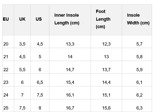 Ver guía de tallas en las imágenes, medir el pie y añadir 0.8-10mm a la longitud total del pie (desde el talón hasta el dedo más largo) y elegir la talla que más se acerque a esa medida.