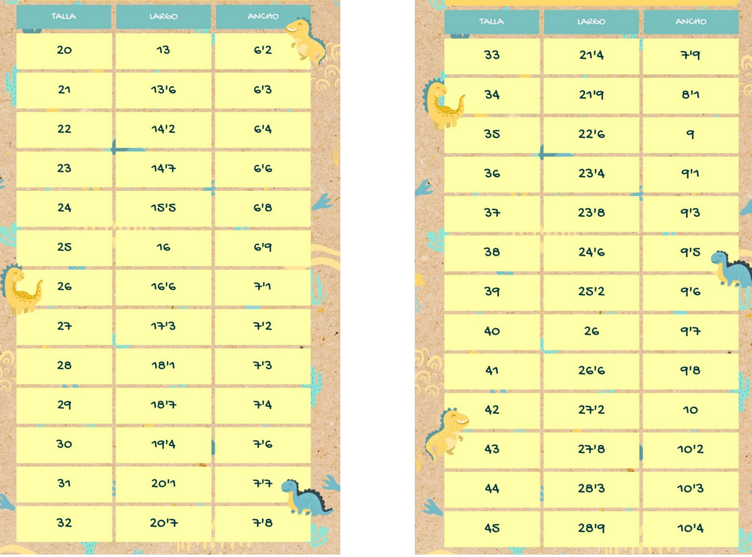 Ver en las imágenes la guía de tallas, contacta con nosotras antes cualquier duda o pásate a probarlas en nuestra tienda física Pies de Hacha.