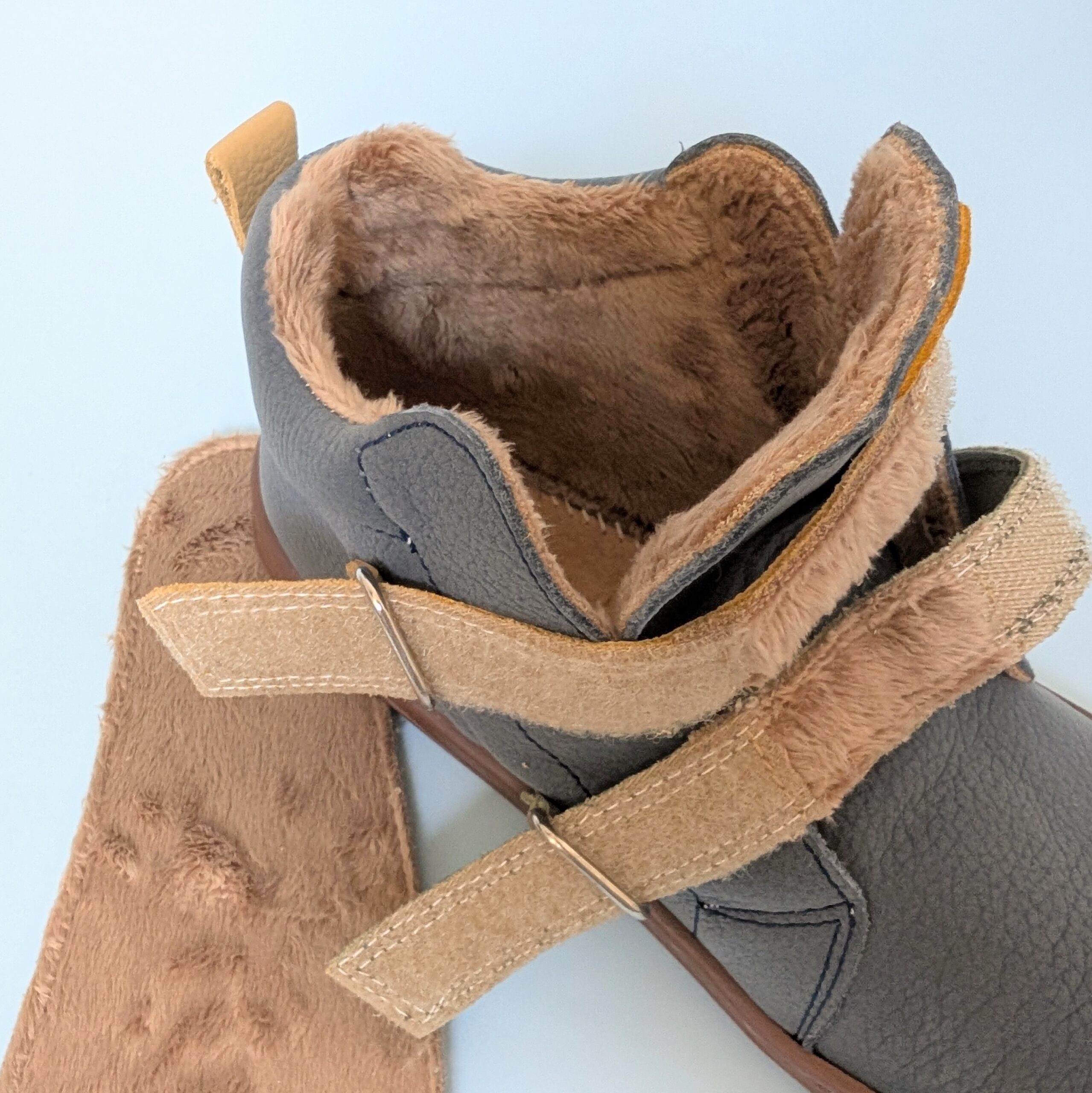 Estas botas infantiles barefoot están pensadas para acompañar a los peques en sus aventuras invernales, manteniendo los pies cómodos, secos y calentitos. Confeccionadas en piel suave y resistente de un bonito tono azul grisáceo, destacan por su alta calidad: acabado repelente al agua y la suciedad, ideal para el día a día. Se limpian fácilmente con un paño ligeramente húmedo, así que siempre estarán listas para la siguiente salida.