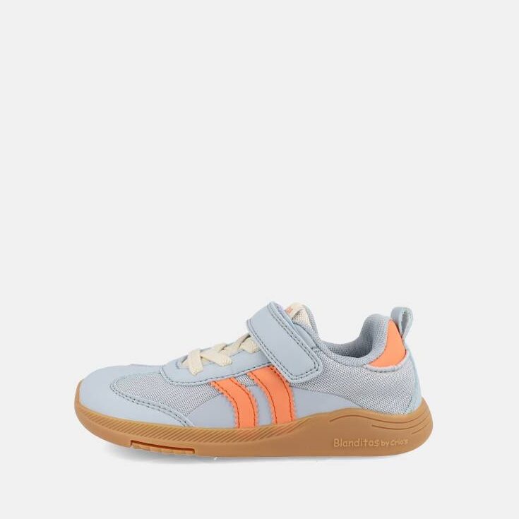 Estas zapatillas infantiles combinan estilo, practicidad y respeto por el desarrollo natural del pie. Su diseño en color azul pastel se completa con dos rayas naranja laterales que aportan un toque deportivo, y una suela de goma con aire retro que les da un carácter especial.