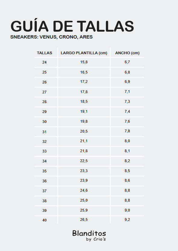 Ver guía de tallas en las imágenes, añadir 0.8-1cm al largo del pie para dar con la talla que mejor se ajusta. Si tienes cualquier duda contacta con nosotras vía teléfono, whastapp o al correo 🙂