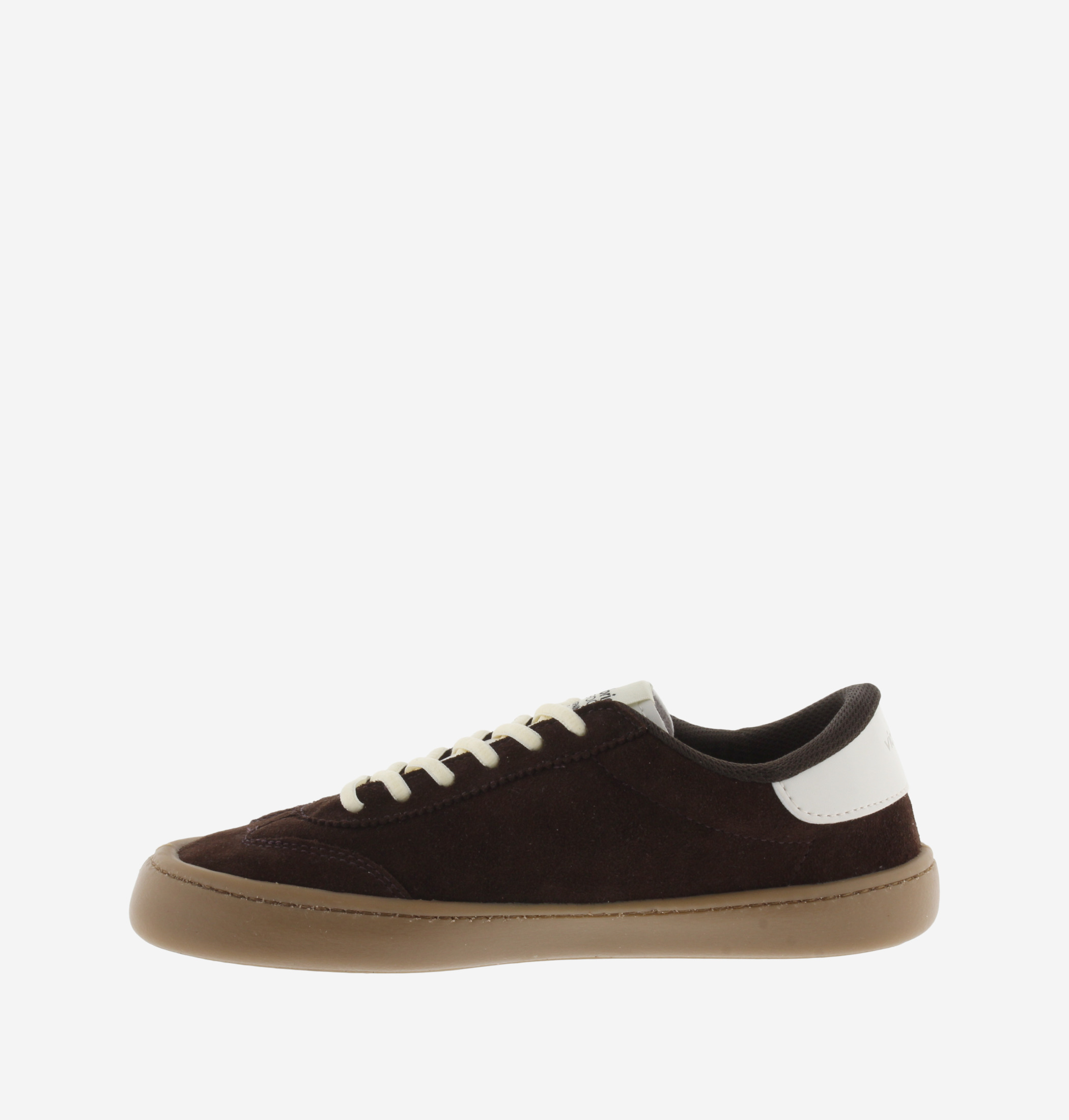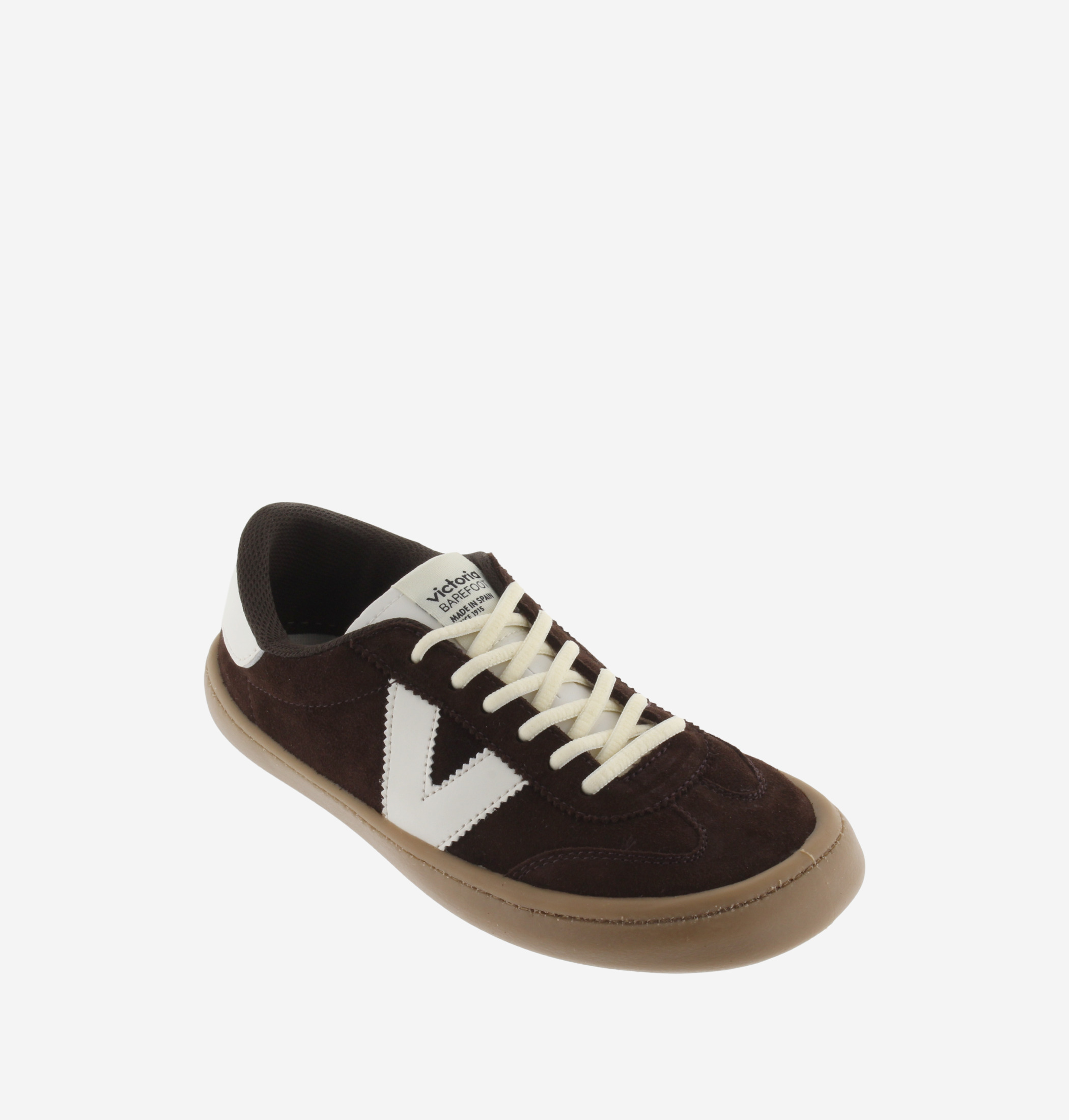 Estas zapatillas barefoot en un profundo color marrón chocolate, con detalles en blanco y suela en color caramelo, es un diseño sencillo y con un aire retro. Están hechas en España, el exterior es de serraje con certificado LWG (Leather Working Group), y detalles en piel sintética. El interior de la zapatilla es textil y algodón.