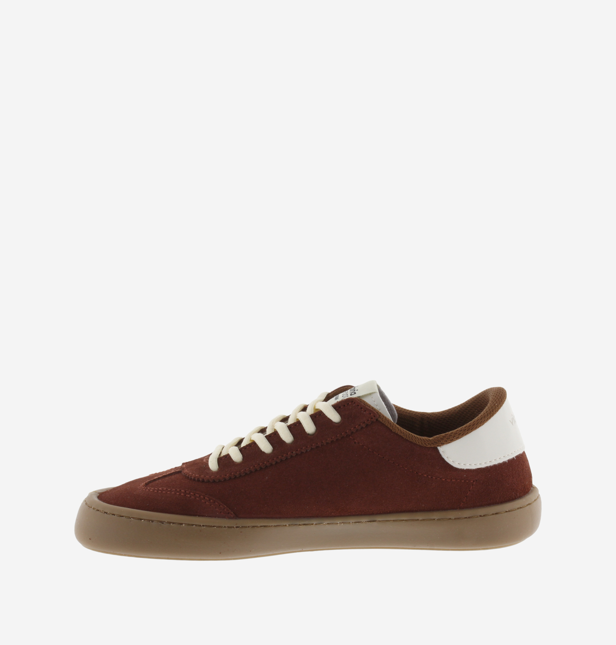 Estas zapatillas barefoot en un precioso color terracota, con detalles en blanco y suela en color caramelo, es un diseño sencillo y con un aire retro. Están hechas en España, el exterior es de serraje con certificado LWG (Leather Working Group), y detalles en piel sintética. El interior de la zapatilla es textil y algodón.