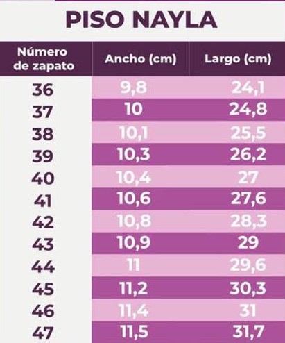 La horma Nayla de Coqueflex es amplia, lo que resulta ideal para pies medios y anchos, ya que proporciona un ajuste cómodo y deja espacio suficiente para el movimiento de los dedos, evitando presiones innecesarias.