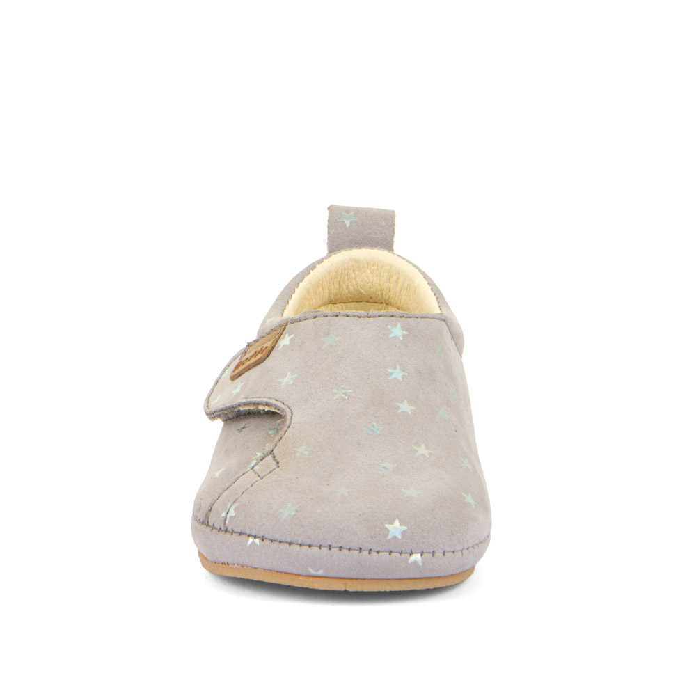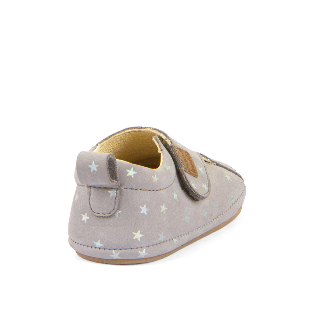 El exterior de piel en color gris presenta un bonito estampado de estrellas. El interior combina piel y textil, creando un entorno cómodo, transpirable y suave al tacto, ideal para los pies delicados de los más pequeños. El cierre de velcro permite ajustar el calzado fácilmente al empeine, asegurando un buen agarre sin apretar, y facilitando que mamás y papás puedan calzarles sin esfuerzo.